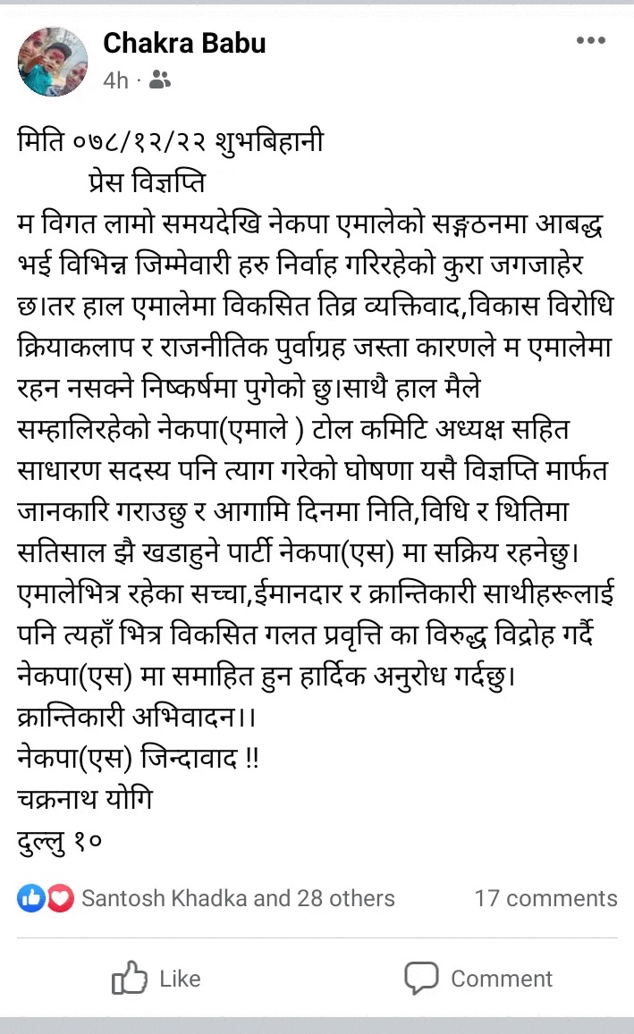 २२ चैत्र २०७८ दैलेख । नेकपा(एमाले) दुल्लु १० मा टाेल कमिटि अध्यक्ष चक्रनाथ याेगि ले पार्टि परित्याग गरेका छन।आज सामाजिक सन्जाल फेसबुक मा विज्ञप्ति जारि गर्दै उनले एमाले भित्र विकसित व्यक्तिवाद,विकासविराेधि प्रवृतिका कारण आफु एमाले परित्याग गर्ने निष्कर्षमा पुगेकाे उल्लेख गरेका छन।साथै उनले वाकि जिवन निति,विधि र संविधान रक्षाका लागि सतिसाल झै खडा भयकाे पाटि नेकपा (एस) मा सक्रिय रहने उल्लेख गरेका छन।साथै उनले नेकपा एमाले भित्र रहेका ईमानदार,कर्तव्यनिष्ठ कार्यकर्ता लाई एमाले भित्र विकसित गलत प्रवृत्तिका विरुद्द विद्राेह गर्दै नेकपा(एस) मा समाहित हुन आह्वान गरेका छन।