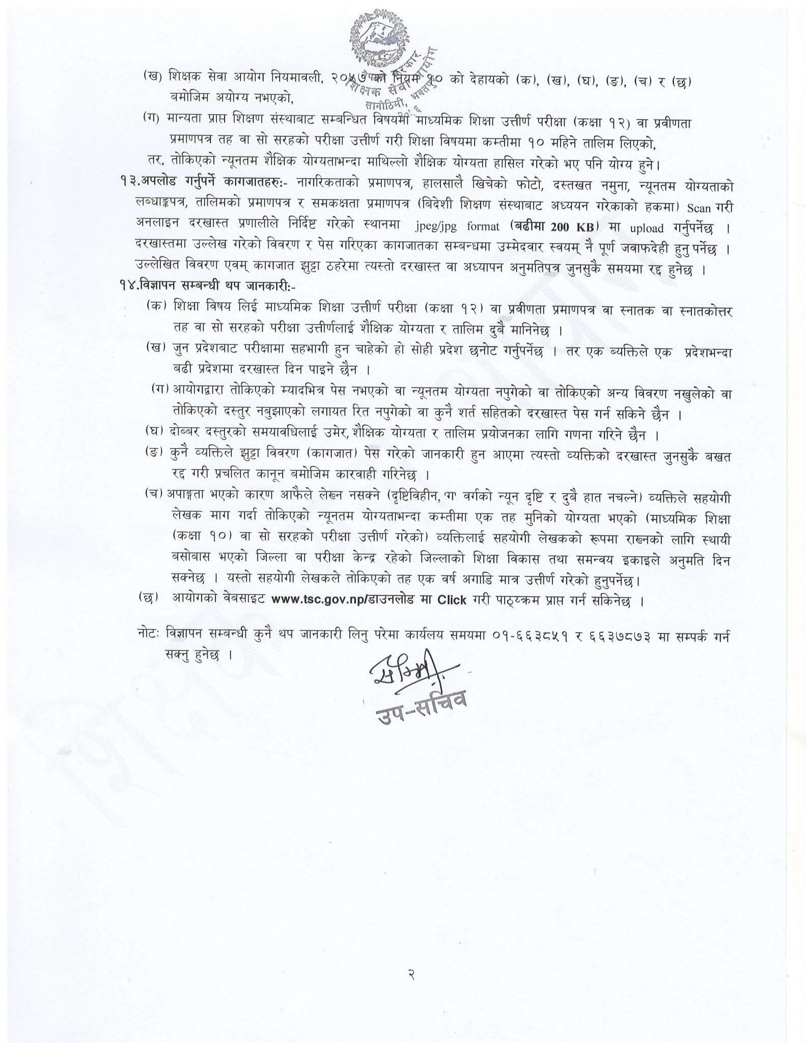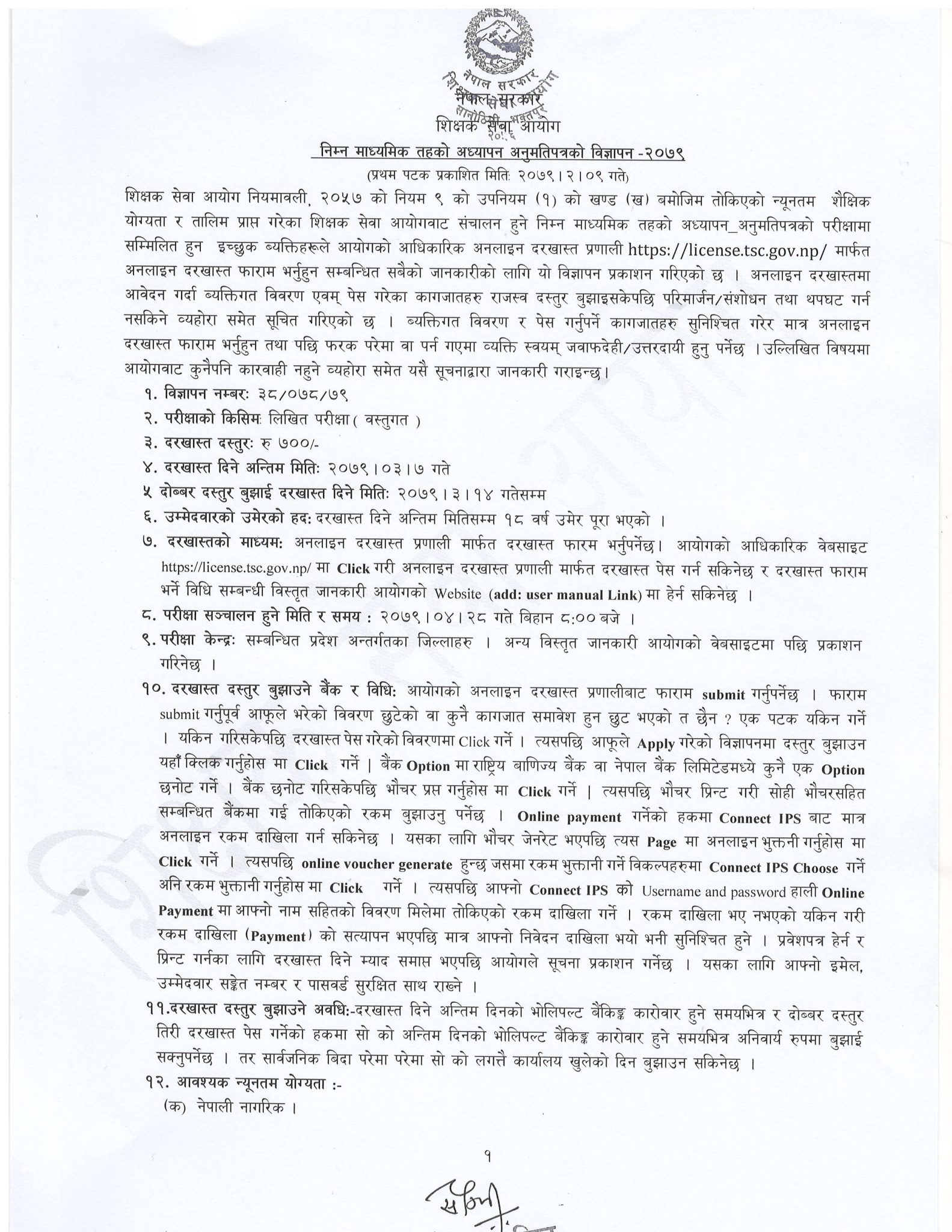 इच्छुक व्यक्तिले अनलाइनमार्फत आवेदन पेस गर्दा तोकिएको दस्तुरसहित नागरिकताको प्रमाणपत्र, हालसालै खिचिएको फोटो, दस्तखत नमूना, न्यूनतम शैक्षिक योग्यताको लब्धाङ्क पत्र, तालिमको प्रमाणपत्र, समकक्षताको प्रमाणपत्र पेस गर्नुपर्नेछ । म्यादभित्र दाखिला नभएको र रीत नपुगी आएको दरखास्त उपर कुनै किसिमको कारबाही नहुने आयोगले जनाएको छ ।