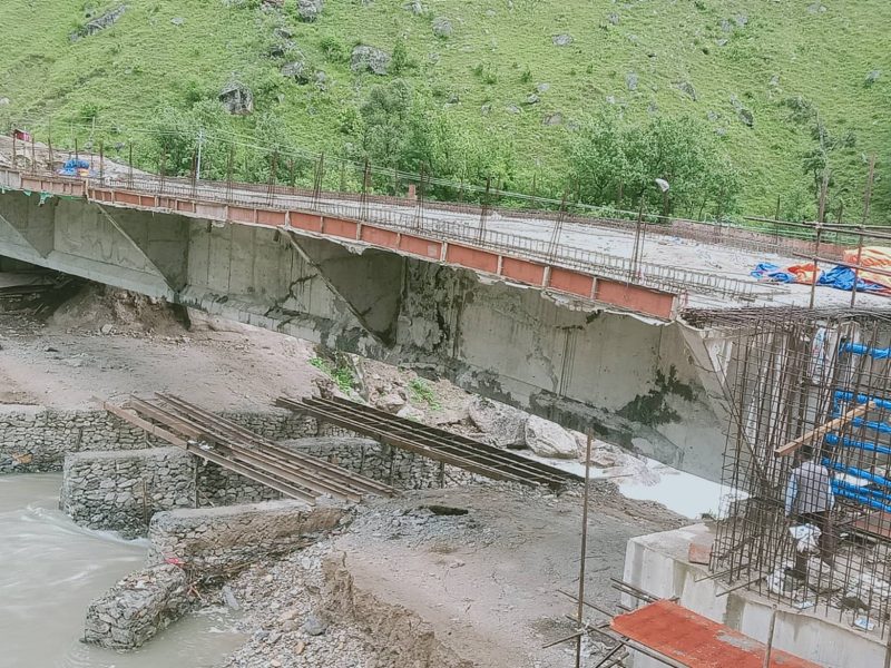३ साउन २०७९ जुम्ला । जुम्ला र कालिकोट जोड्ने हिमा नदीको सिंजाखोला पुल निर्माण सम्पन्न नभएकै चर्किएको छ । पुलको निर्माण कार्य ढलान समेत गरिसकिएको भएपनि चर्किएर खतरा अवस्थामा पुगेको छ । पुल निर्माणको क्रममा ( प्रिस्टेट गर्दा खेरी) चर्किएको सड्क डिभिजन कार्यालय सुर्खेतले जनाएको छ । सड्क डिभिजन कार्यालय सुर्खेतका ईन्जिनियर तुलाराम शर्माका अनुसार कालिकोटको छिडेना र सिंजा खोलाको उक्त पक्कि पुल सयूक्त रुपमा रु १३ करोडको लागतमा निर्माणको जिम्मा दिईएको थियो ।