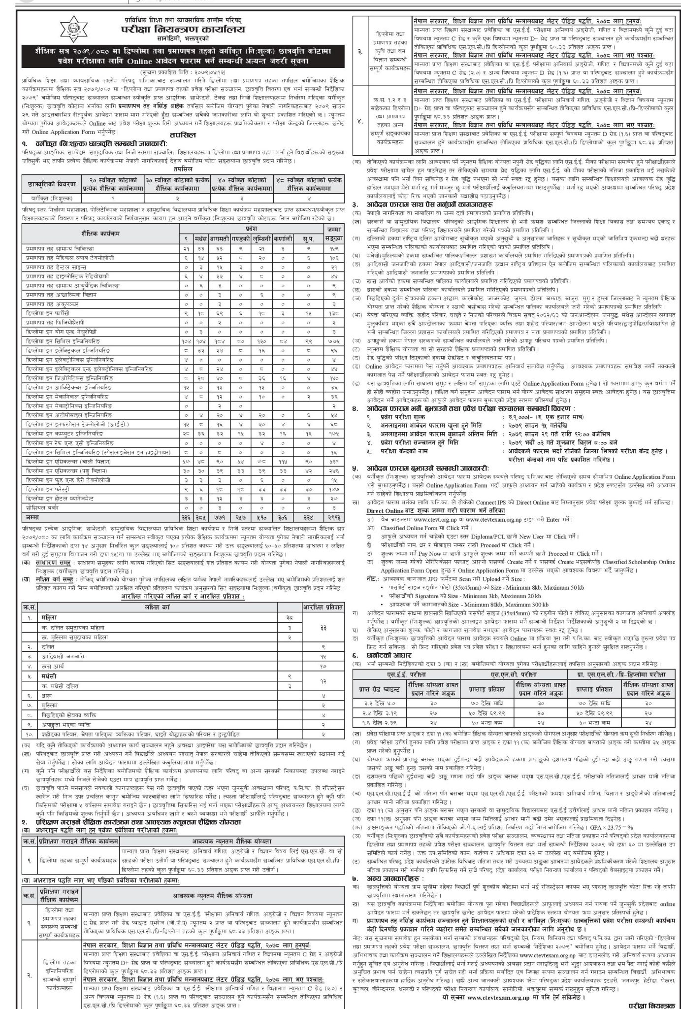 डिप्लोमा तथा प्रमाणपत्र तहका शैक्षिक कार्यक्रमहरूमा शैक्षिक सत्र २०७९/२०८० मा ‘डिप्लोमा तथा प्रमाणपत्र तहको प्रवेश परीक्षा सञ्चालन, छात्रवृत्ति वितरण एवम् भर्नासम्बन्धी निर्देशिका २०७९’ बमोजिम आवेदन माग गरेको हो । परिषद्बाट सञ्चालन सम्बन्धी स्वीकृति प्राप्त आङ्गिक, साझेदारी, टेक्स तथा निजी शिक्षालयहरूमा निर्धारण गरिएका वर्गीकृत (निःशुल्क) छात्रवृत्ति कोटामा भर्नाका लागि प्रमाणपत्र तह नर्सिङ बाहेक सूचना अनुरुप योग्यता पुगेका विद्यार्थीले आवेदन दिन सक्ने आज (बिहीबार) प्रकाशित सूचनामा उल्लेख गरिएको छ ।