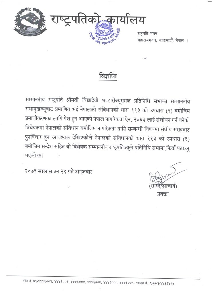 २९ साउन २०७९ काठमाडौं । राष्ट्रपति विद्यादेवी भण्डारीले नागरिकता विधेयक संसदमा फिर्ता पठाएकी छन् । बिज्ञप्ति