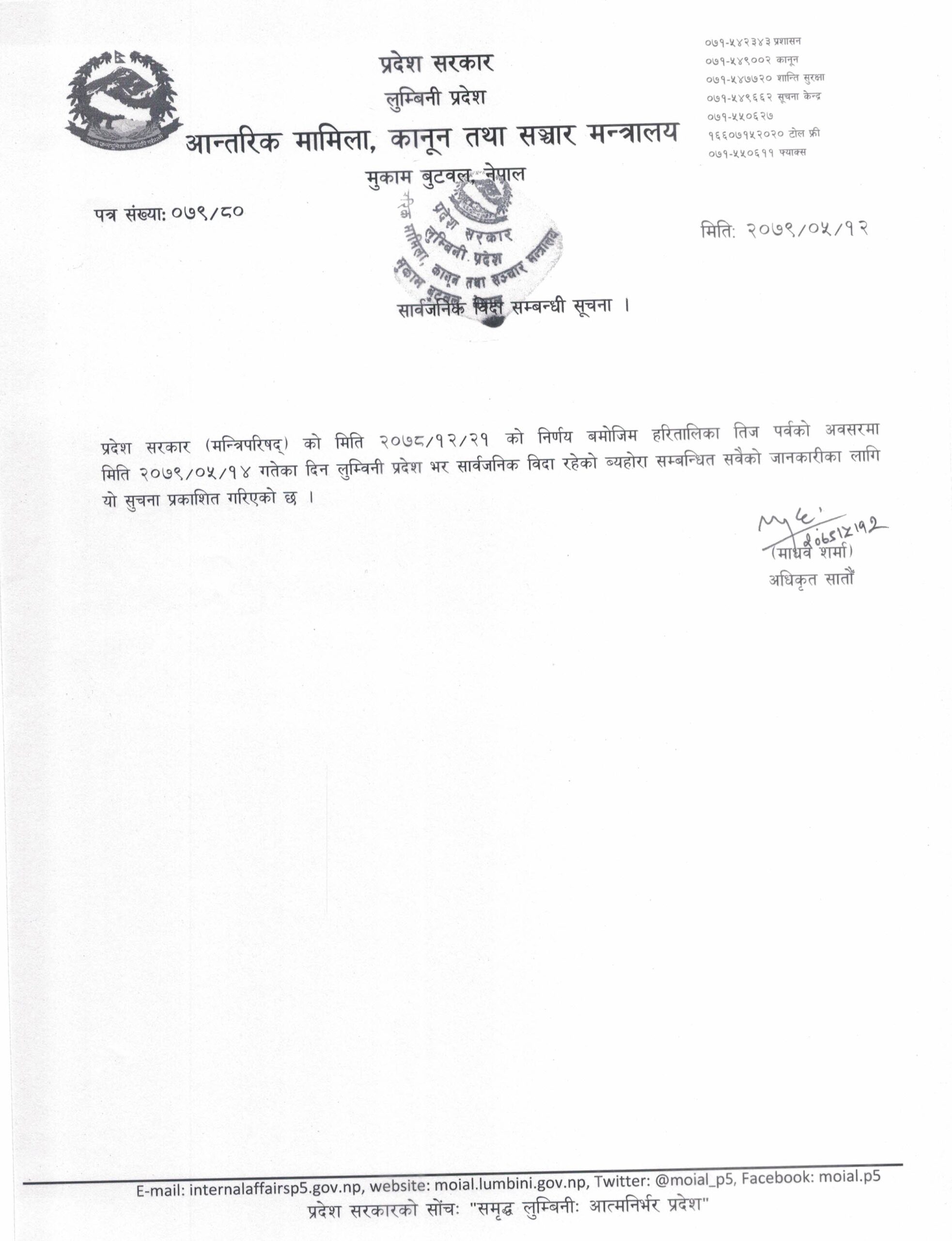 १३ भदाै २०७९ नेपालगंज । लुम्बिनी प्रदेश सरकार मन्त्रीपरिषद को मिति २०७९/०५/१२ गतेको निर्णय बमोजिम प्रदेश भर हरितालिका तिजको अवसरमा मंगलबार सरकारले सार्वजिनिक बिदा दिएको हो ।