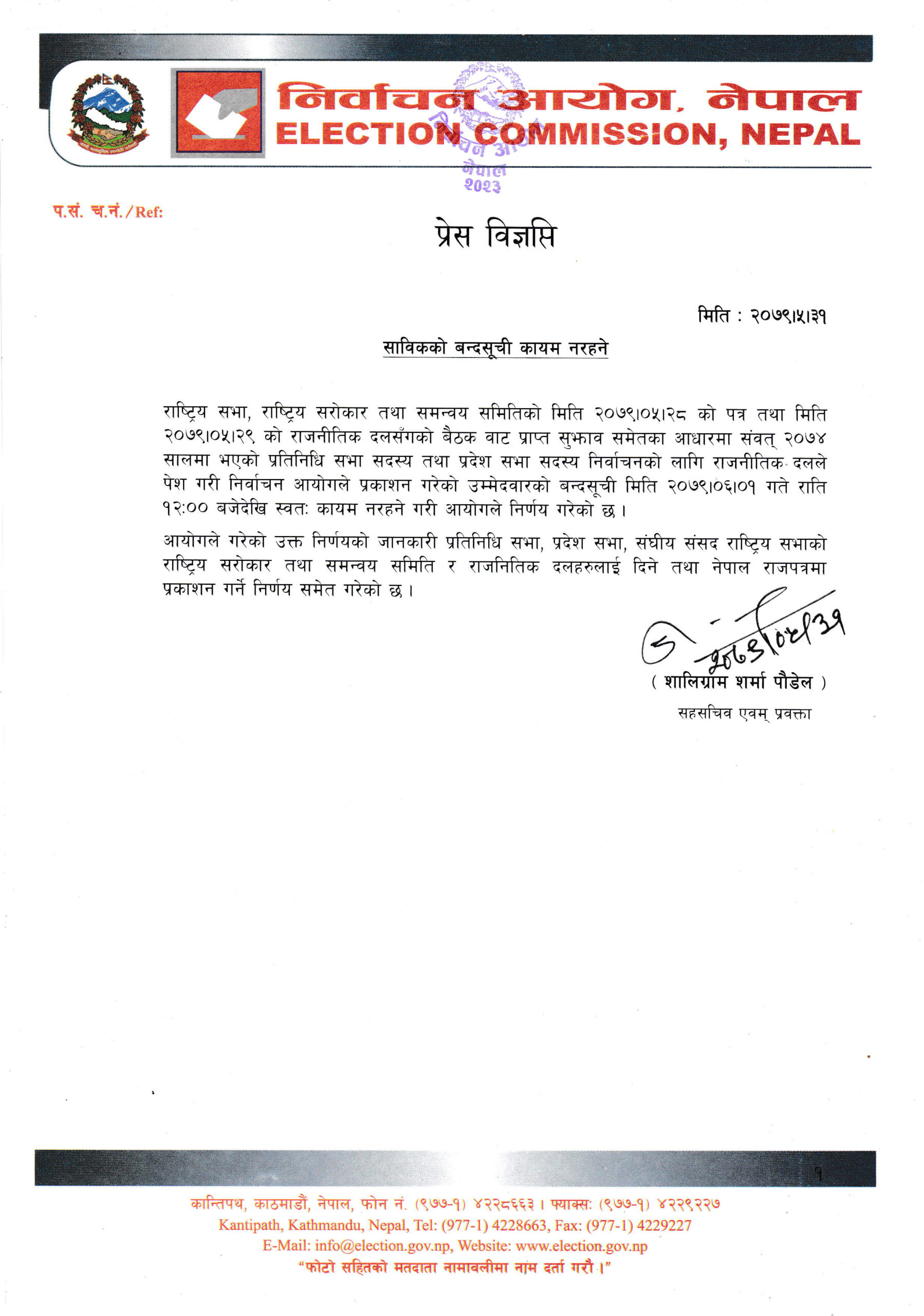 २०७४ सालमा भएको प्रतिनिधि सभा सदस्य तथा प्रदेश सभा सदस्य निर्वाचनको लागि राजनीतिक दलले पेश गरी निर्वाचन आयोगले प्रकाशन गरेको उम्मेदवारको बन्दसूची मिति २०७९।०६।०१ गते राति १२ः०० बजेदेखि स्वतः कायम नरहने गरी आयोगले निर्णय गरेको छ’, विज्ञप्तिमा भनिएको छ ।