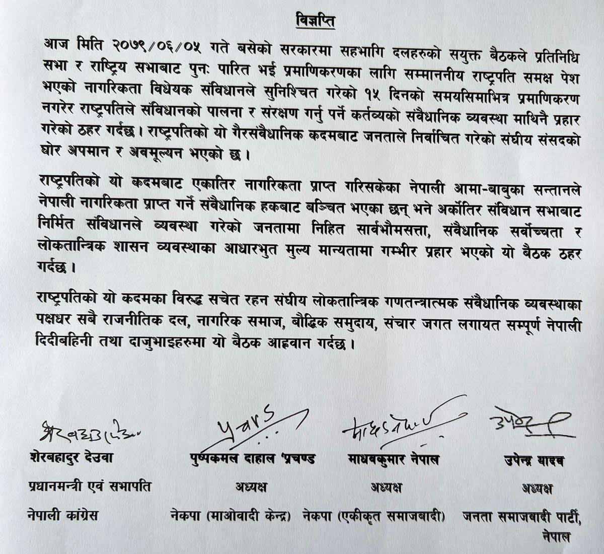 चार दलले राष्ट्रपतिको कदमविरुद्ध सचेत रहन संघीय लोकतान्त्रिक गणतन्त्रात्मक संवैधानिक व्यवस्थाको पक्षधर राजनीतिक दल, नागरिक समाज, वौद्धिक समुदायलाई आह्वान गरेको छ ।