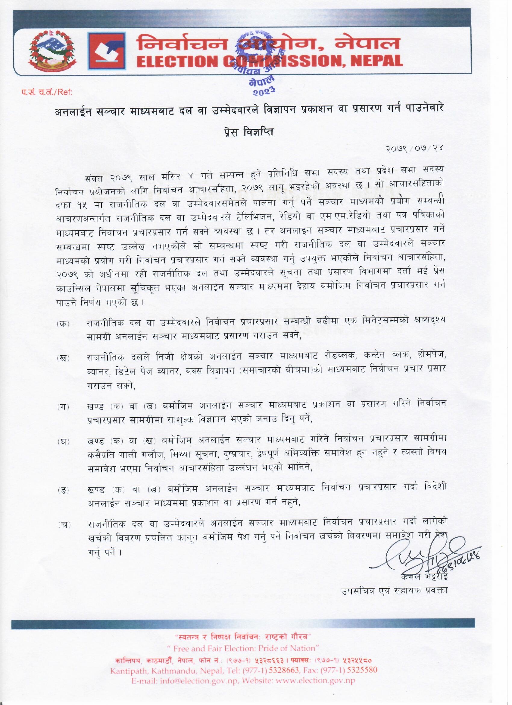 आयोगका अनुसार राजनीतिक दल वा उम्मेदवारले टेलिभिजन, रेडियो वा एम.एम. रेडियो तथा पत्र पत्रिकाको माध्यमबाट निर्वाचन प्रचारप्रसार गर्न सक्ने छन् । यस्तै राजनीतिक दल तथा उम्मेदवारले सूचना तथा प्रसारण विभागमा दर्ता भई प्रेस काउन्सिलमा सूचीकृत भएका अनलाइन सञ्चार माध्यममा प्रचारप्रसार गर्न पाउने छन् ।