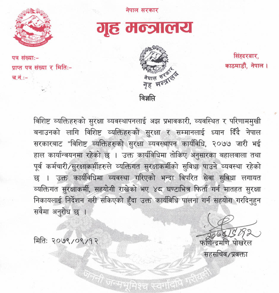 मन्त्रालयका प्रवक्ता फणिन्द्रमणि पोखरेलले विज्ञप्ति जारी गरी बहालवाला तथा पूर्व कर्मचारी÷सुरक्षाकर्मीहरुले कार्यविधिमा तोकिएअनुसार मात्र व्यक्तिगत सुरक्षाकर्मीको सुविधा पाउने बताएका छन् ।