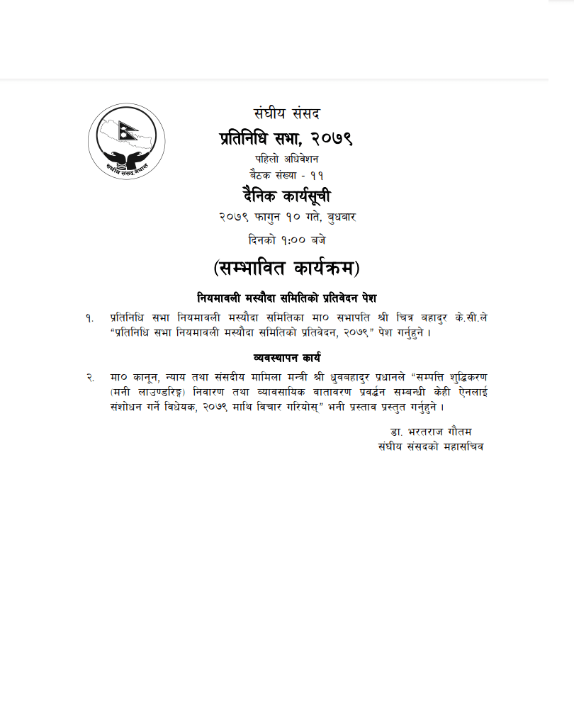 त्यसैगरी कानुन, न्याय तथा संसदीय मामिला मन्त्री ध्रुवबहादुर प्रधानले ‘सम्पत्ति शुद्धीकरण निवारण तथा व्यावसायिक वातावरण प्रवर्द्धन सम्बन्धी केही ऐनलाई संशोधन गर्ने विधेयक, २०७९ पनि संसद्मा पेस गर्ने सम्भावित कार्यसूची रहेको संसद् सचिवालयले जनाएको छ ।
