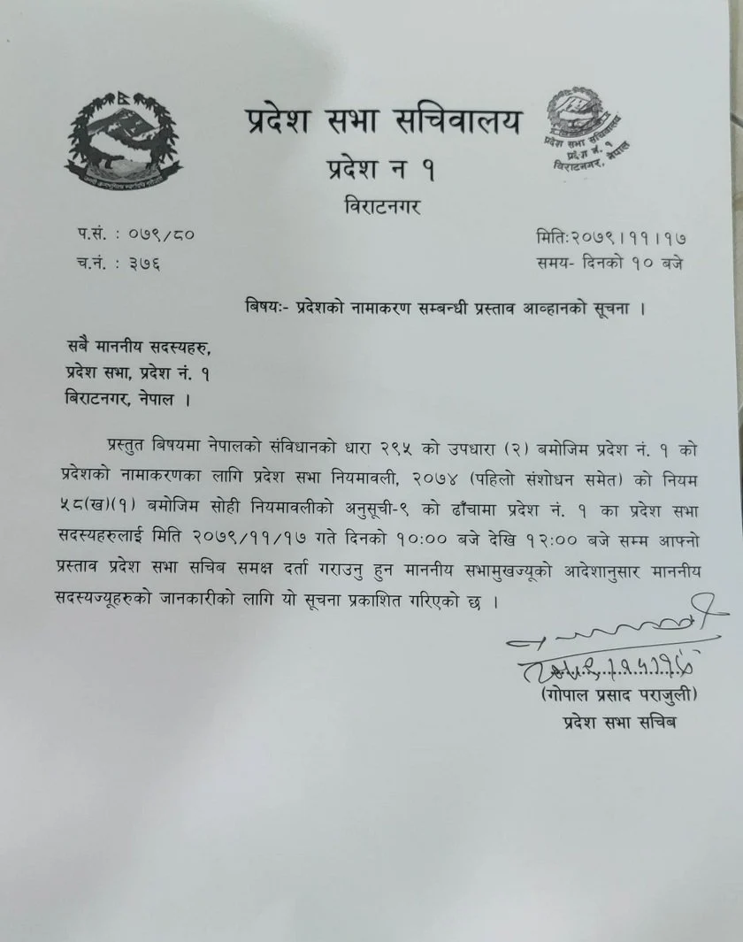 सभामुखको आदेशानुसार सचिव पराजुलीले प्रकाशित गरेको सूचनामा प्रदेशसभा नामकरणका लागि प्रदेशसभा नियमावली, २०७४ ९पहिलो संशोधनसमेत० को नियम ५८ (ख) (१) बमोजिम सोही नियमावलीको अनुसूची–९ को ढाँचामा प्रस्ताव पेस गर्न भनिएको छ । प्रदेशसभा सचिवालयले प्रदेश नामकरण प्रस्ताव पेस भइ निर्णय हुने गरी आजको प्रदेशसभा बैठकको कार्यसूची उल्लेख गरेको छ ।