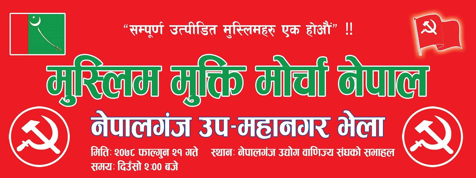यस्तै मुस्लिम मुक्ती माेर्चा नेपाल, नेपालगंज उपमहानगर भेला हुने भएकाे छ । संगठन शुदृढ विस्तार तथा जनपरिचालन अभियानमा मुस्लिम मुक्ति मोर्चा नेपाल नेपाल उप-महानगरपालिका को भेलामा २३ वटै वडाबाट मुस्लिम मुक्ति मोर्चा का सम्पूर्ण सदस्यहरु र तीन वटै कमाण्ड का संयोजक सह-संयोजक नगर कमिटी सदस्य वडा कमिटी अध्यक्षहरुलाई भेलामा बाेलाईएकाे छ । भेला नेपालगंज उद्योग बाणिज्य संघकाे सभाहलमा हुने अध्यक्ष शाही बताउनुभयाे ।