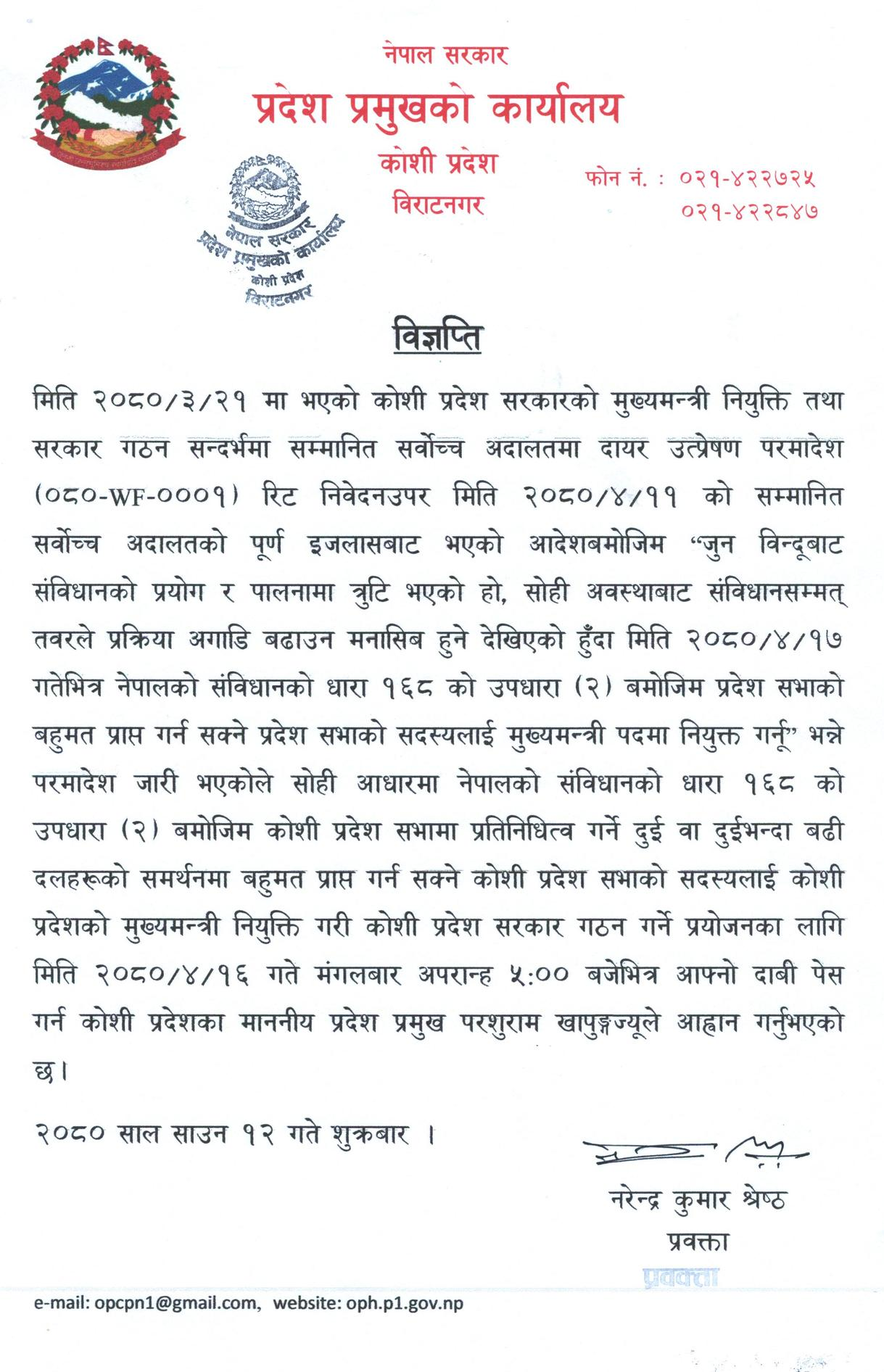१२ साउन २०८० काठमाडौं । कोशी प्रदेशको मुख्यमन्त्रीका लागि ४ दिनभित्र दाबी पेश गर्न आह्वान भएको छ । प्रदेश प्रमुख परशुराम खापुङले १६ गते अपराह्न ५ बजेभित्र संविधानको धारा १६८ (२) अनुसार दुई वा दुईभन्दा बढी दलको सर्मथमा बहुमत प्राप्त गर्न सक्ने प्रदेशसभा सदस्यलाई मुख्यमन्त्रीमा दाबी पेश गर्न आह्वान गरेका हुन् ।