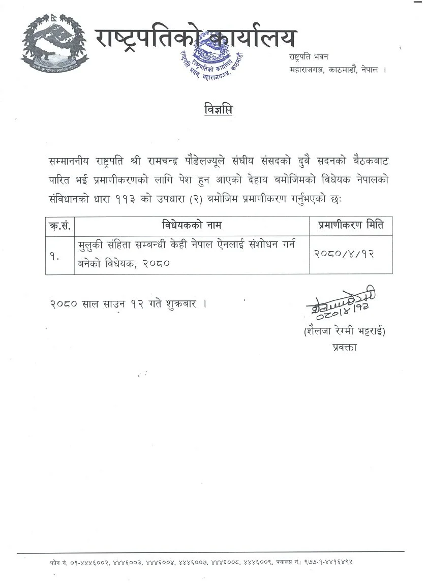 राष्ट्रपतिले नेपालको संविधानको धारा ११३ को उपधारा (२) बमोजिम उक्त विधेयक प्रमाणीकरण गर्नुभएको राष्ट्रपति कार्यालयका प्रवक्ता शैलजा रेग्मी भट्टराईले जानकारी दिएकी छन् । सो विधेयक बिहीबार राष्ट्रियसभाबाट सर्वसहमतिले पारित भएको थियो ।