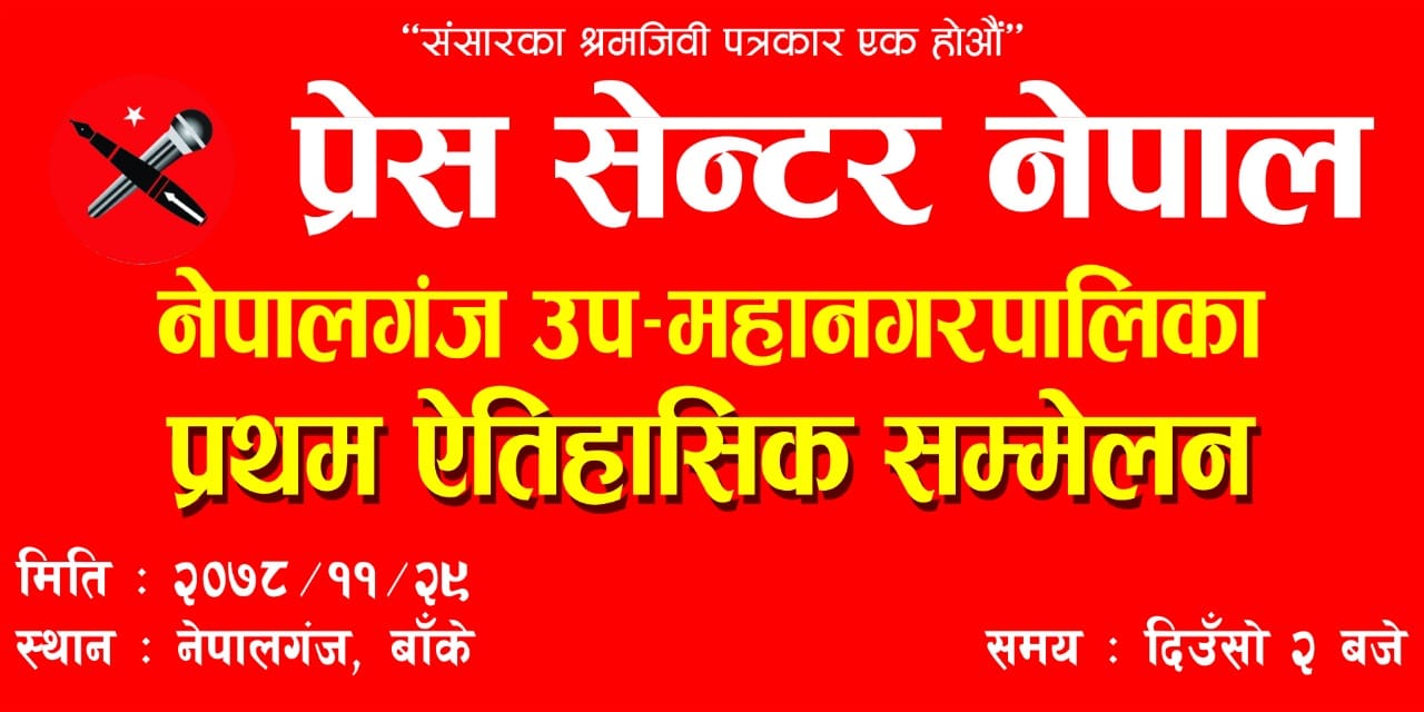 २८ फागुन २०७८ नेपालगंज । प्रेस सेन्टर नेपाल नेपालगंज उप-महानगरपालिकाकाे प्रथम सम्मेलन नेकपा माओवादी केन्द्र नेपालगंजकाे पार्टी कार्यालयमा हुने भएकाे छ । सम्मेलनमा प्रेस सेन्टर आवद्ध सम्पुर्ण सदस्यहरु र जिम्मेवार नेताहरुलाई फागुन २९ गते दिउसाे २ बजे सम्मेलनमा बाेलाईएकाे प्रेस सेन्टर नेपाल बाँके अध्यक्ष डक्ट प्रसाद धितालले जानकारी दिनुभयाे ।