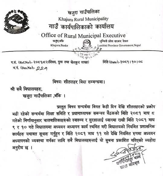 यस्तै खजुरा गाउँपालिकाले पनि चिसोका कारण दुई दिन बिदादिएको खजुरा गाउँपालिकाले जनाएको छ ।