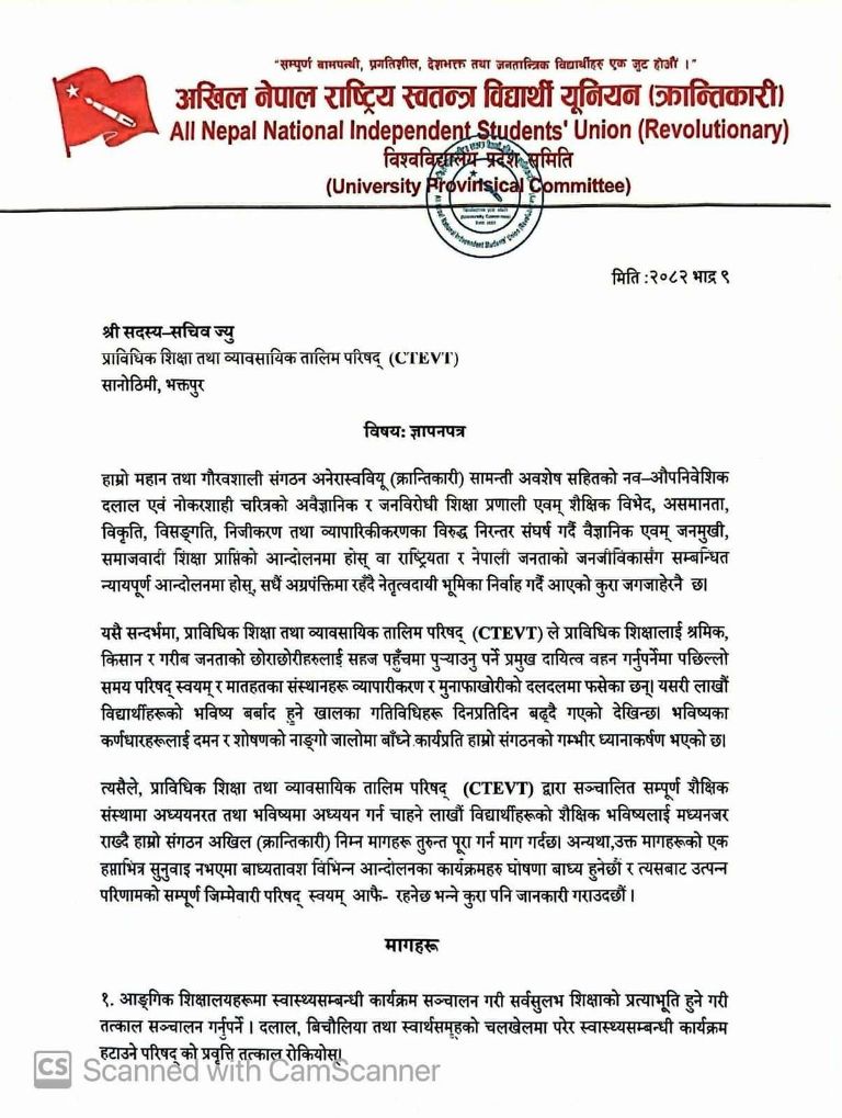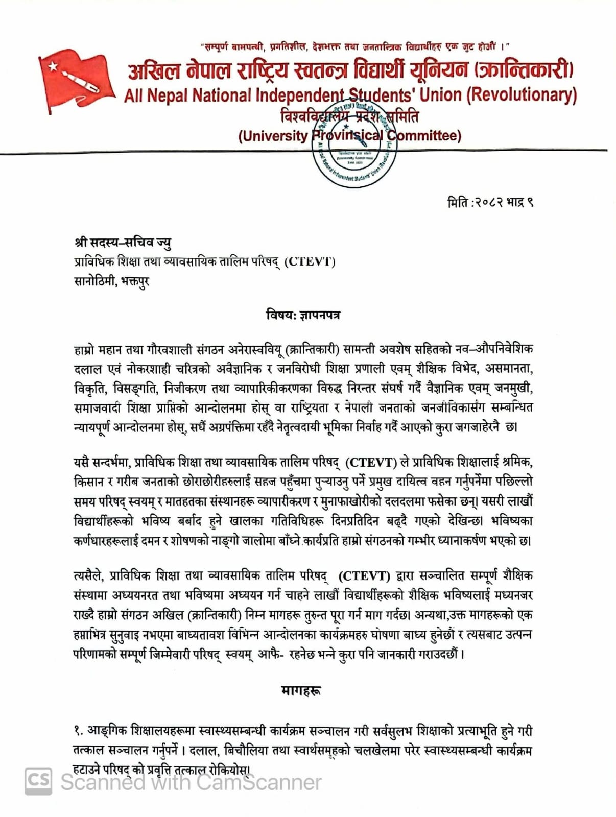 अनेरास्ववियु (क्रान्तिकारी) ले लाखौँ विद्यार्थीहरूको भविष्य बर्बाद हुने खालका गतिविधिहरू सीटीईभीटीले गरिरहेको भन्दै सोमबार भक्तपुर सानो ठिमीस्थित सीटीईभीटीको केन्द्रीय कार्यालयमा पुगेर ज्ञापनपत्र बुझाएको हो ।