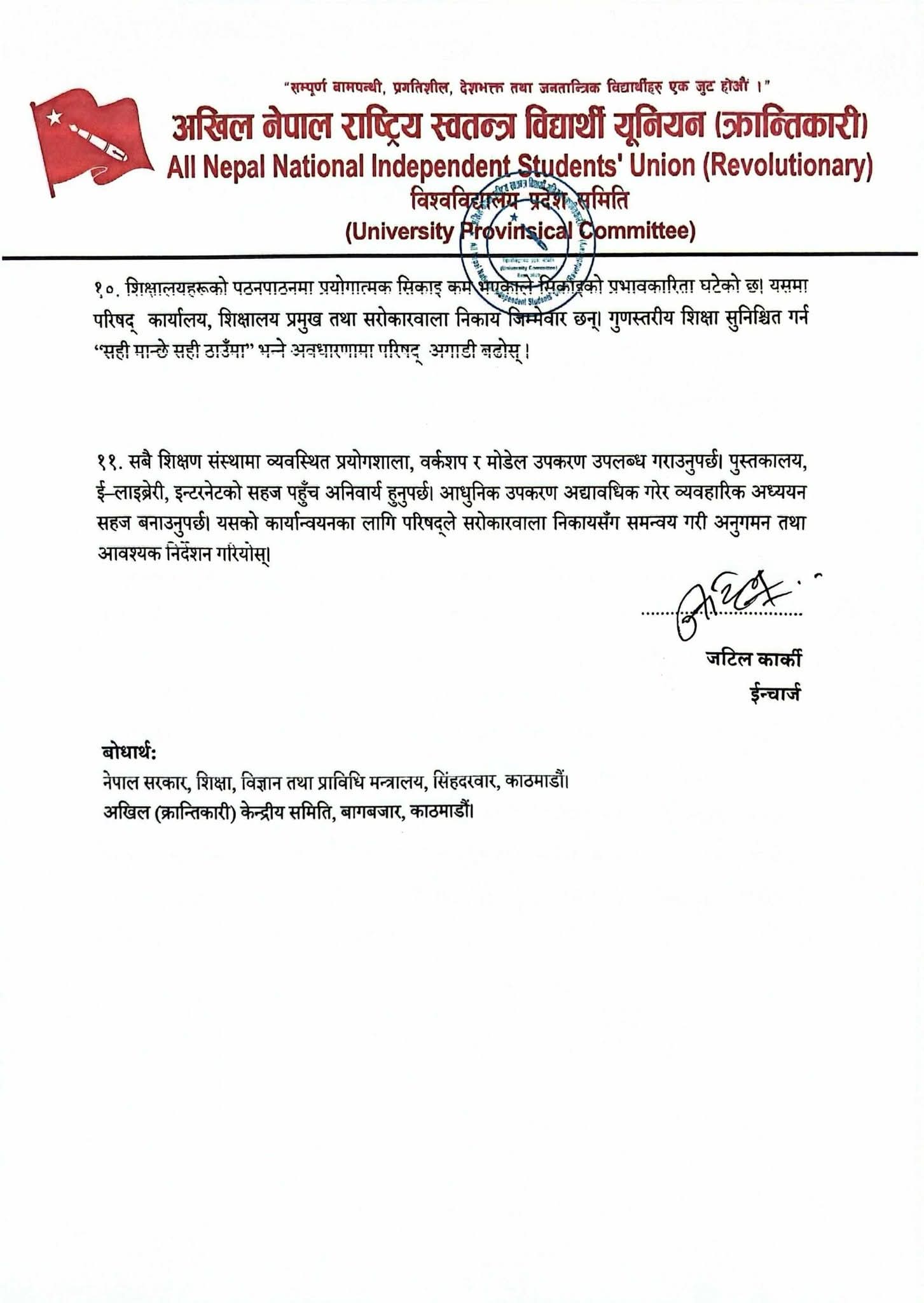 ज्ञापनपत्रमा भनिएको छ, “लाखौँ विद्यार्थीहरूको भविष्य बर्बाद हुने खालका गतिविधिहरू दिनप्रतिदिन बढ्दै गएको देखिन्छ । भविष्यका कर्णधारहरूलाई दमन र शोषणको नाङ्गो जालोमा बाँध्ने कार्यप्रति संगठनको गम्भीर ध्यानाकर्षण भएको छ ।”