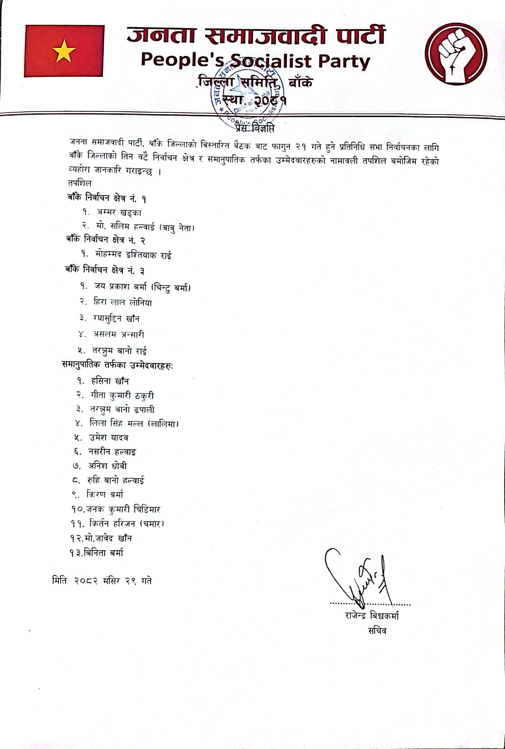पार्टीको जिल्ला स्तरीय विस्तारित बैठकमार्फत बाँकेका तीनवटै निर्वाचन क्षेत्र तथा समानुपातिक तर्फका उम्मेदवारहरूको नामावली सार्वजनिक गरिएको हो। पार्टी सचिव राजेन्द्र विश्वकर्माद्वारा जारी प्रेस विज्ञप्ति अनुसार बाँके निर्वाचन क्षेत्र नं. १ बाट अम्मर खड्का र मो. सलिम हल्वाई (बाबु नेता) उम्मेदवार सिफारिस भएका छन्।