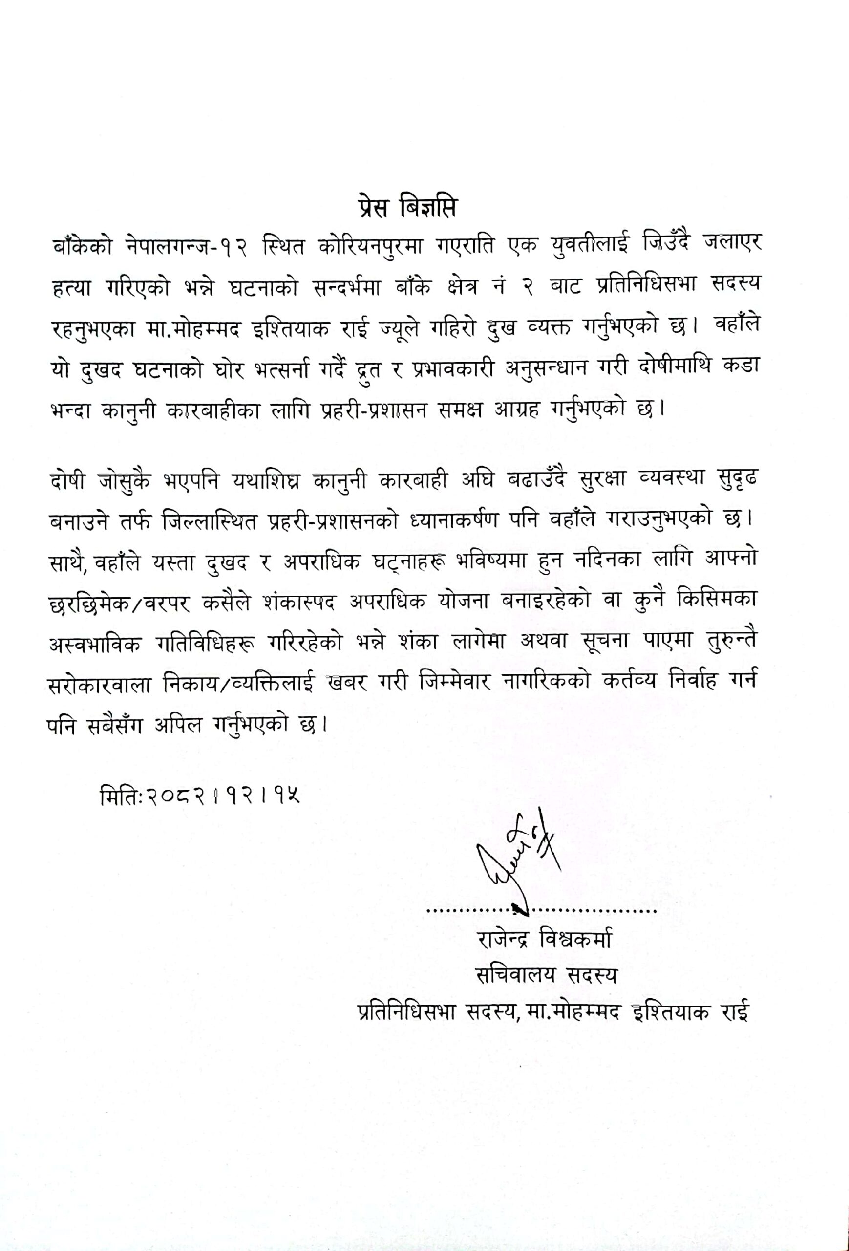 बाँके । नेपालगञ्ज उपमहानगरपालिका–१२, कोरियनपुर क्षेत्रमा एक युवतीलाई जीवितै जलाएर हत्या गरिएको घटनाले नेपालगन्ज स्तब्ध बनेको छ। उक्त घटनाप्रति बाँके क्षेत्र नं. २ बाट प्रतिनिधिसभा सदस्य पुर्व मन्त्री मोहम्मद इस्तियाक राईले गहिरो दुःख व्यक्त गरेका छन्।